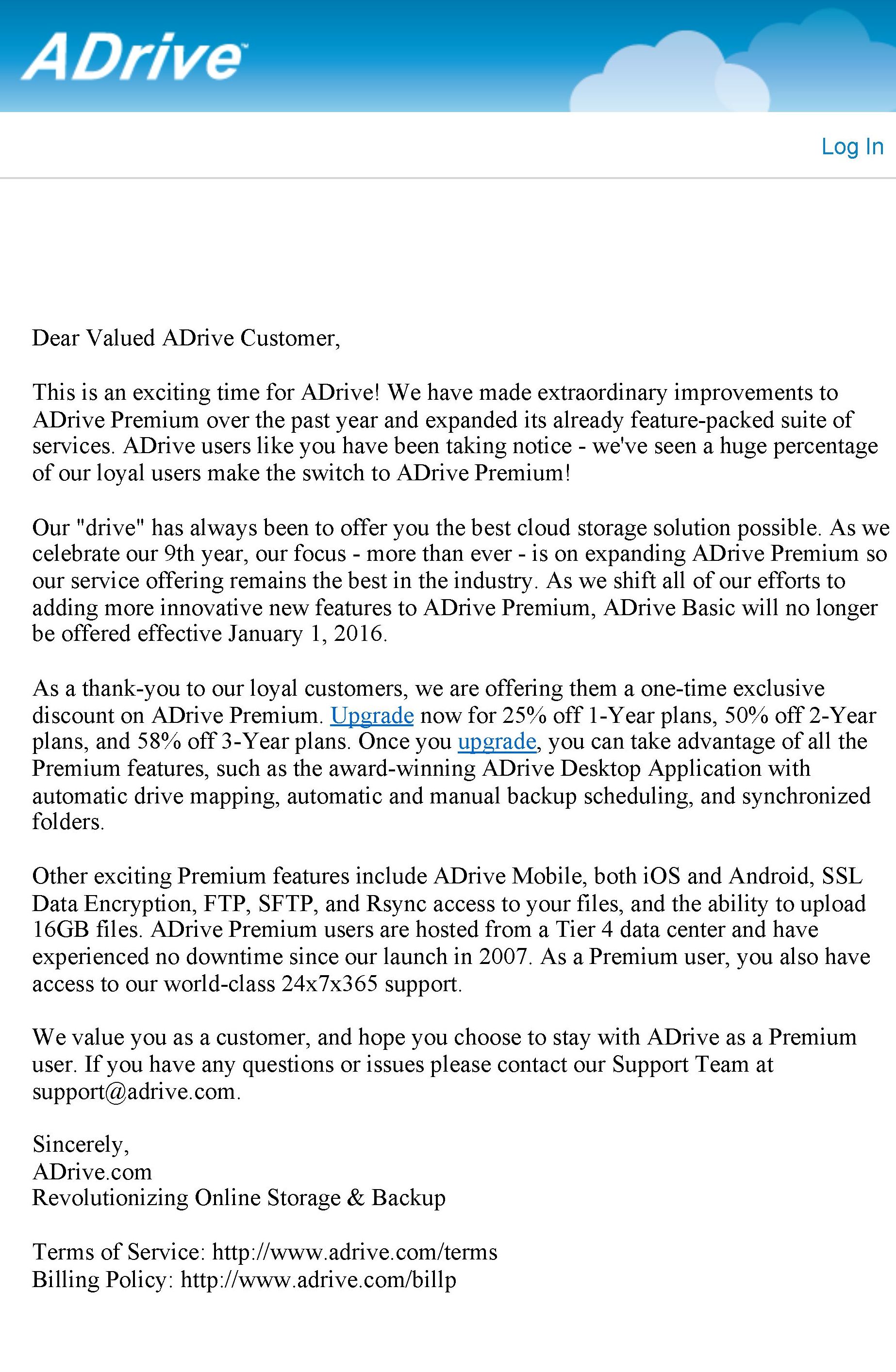 L’e-mail arrivatami qualche giorno fa da ADrive, servizio che nel frattempo ho continuato seppur sporadicamente ad usare, e con la quale mi si avvisa che nell’ottica del continuo miglioramento e potenziamento del servizio la versione Basic a partire dall’1 gennaio 2016 scomparirà (proponendomi nel contempo di abbonarmi alla versione Premium a prezzo vantaggioso), mi ha spinto a controllare come sono messi i summenzionati servizi a distanza di un lustro (nota: per chi volesse rileggersi quanto scritto a suo tempo nel libro, di riferimento è il par. 3.4).