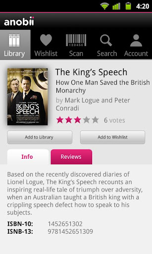 Premesso che in qualità di felice possessore di Acer Metal Liquid lavoro in ambiente Android, vediamo un po’ alcune caratteristiche della nuova applicazione. Di quest’ultima salta immediatamente agli occhi il gradevole restyling grafico (logo incluso) e la posizione di assoluta centralità mantenuta dalla funzione Scan barcode; per il resto, paradossalmente, non mi sembra siano state aggiunte nuove funzionalità / schermate e se è stato fatto non ho idea di dove siano state annidate! E’ nettamente migliorata, quello sì, la velocità di caricamento dei libri nel proprio scaffale così come quella di visualizzazione dei commenti (escludo si tratti di un semplice fattore di connessione perché nel momento in cui si accetta il download degli aggiornamenti si specifica che tra le caratteristiche della nuova versione c’è proprio la velocità e la rimozione di alcuni bug che, confermo, affliggevano spesso e volentieri la precedente) ma in fin dei conti si tratta di poca roba perché, scusate, è o non è ormai il minimo sindacabile che un’applicazione sia veloce e non si impalli?! Ed era troppo “pretendere” una qualche novità?